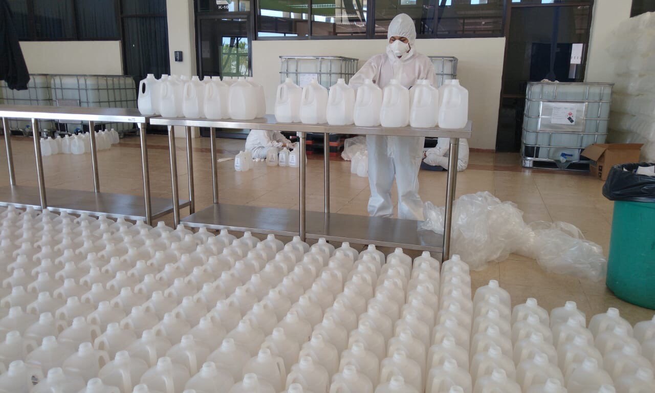 “Las personas que participan en el proceso lo hacen portando sus debidos guantes, cubrebocas, un traje especializado como portan los químicos que cubre todo el cuerpo y las extremidades así como unos cubrezapatos para evitar que pueda haber contacto con el producto, en este caso, el gel antibacterial que se está envasando”, detalló.