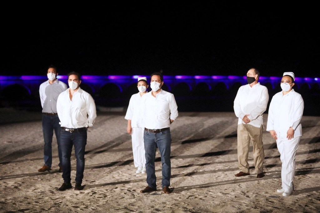 Progreso, Yucatán, 10 de julio de 2020.- En reconocimiento al personal médico, de intendencia, enfermeros y camilleros de Yucatán, desde hoy y cada viernes, el viaducto de arcos de Progreso se iluminará de color azul, que es el distintivo internacional para reconocer el trabajo del personal del área de la salud, por lo que el Gobernador Mauricio Vila Dosal, junto con un grupo de trabajadores de este sector, encabezó el encendido de este lugar emblemático del puerto yucateco.