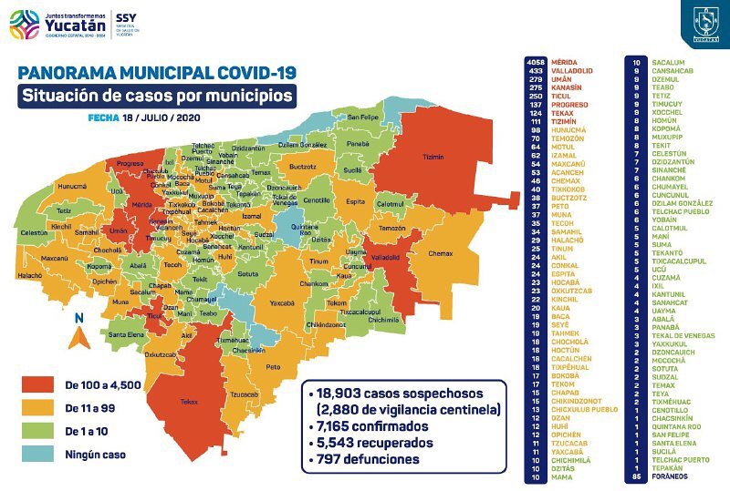 Específicamente, en Mérida se han diagnosticado 3,942 personas contagiadas de coronavirus (casos acumulados al 16 de julio), que viven en: