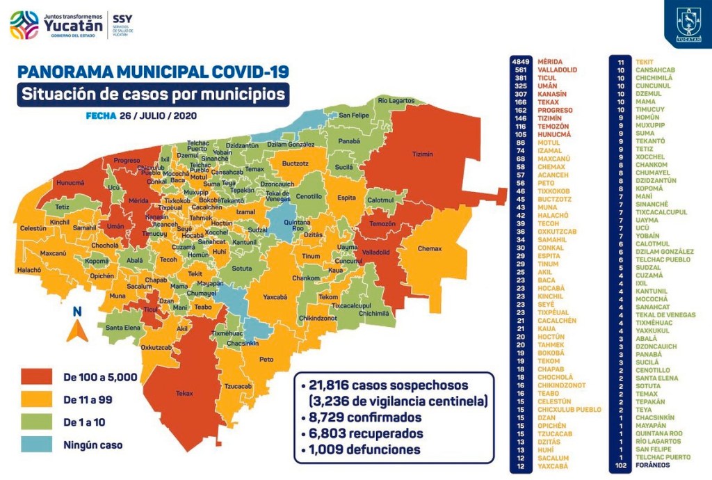 Específicamente, en Mérida se han diagnosticado 4,764 personas contagiadas de Coronavirus (casos acumulados al 25 de julio), que viven en: