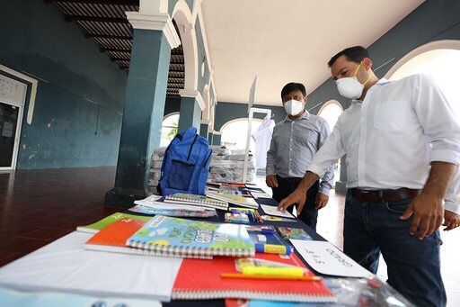 En su gira de trabajo por ambos municipios, Vila Dosal realizó la supervisión de entrega de paquetes de útiles escolares del programa “Impulso Escolar” para beneficio de 272, 840 alumnos de nivel primaria de todo el estado y de secundaria del interior del estado y comisarías de Mérida, así como los desayunos escolares que se reparten entre 115,000 estudiantes de preescolar y primero y segundo grado de primaria de todo el estado, para que los menores cuenten con esos productos alimenticios, aunque por el momento no haya clases presenciales.