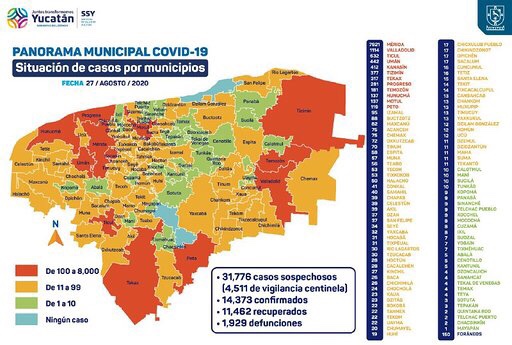 Específicamente, en Mérida se han diagnosticado 7,845 personas contagiadas de Coronavirus (casos acumulados al 26 de agosto), que viven en: