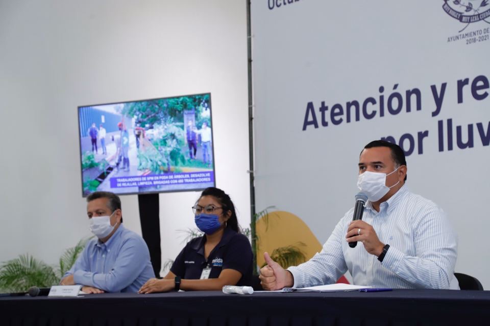 Mérida, 12 de octubre de 2020. En rueda de prensa que encabezó esta mañana, el alcalde Renán Barrera Concha dio a conocer un balance de las actividades realizadas hasta hoy para el apoyo de la población que resultó más afectada por las inundaciones causadas por las fuertes lluvias que han afectado al municipio.