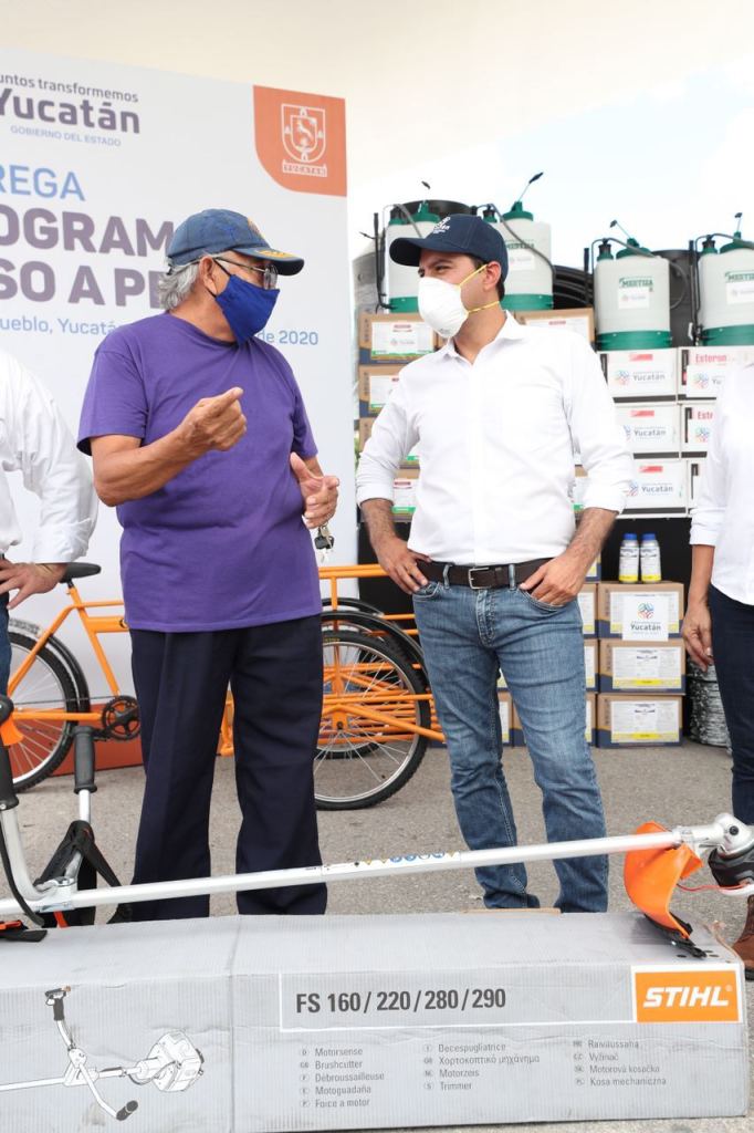 Telchac Puerto, Yucatán, 15 de octubre de 2020.- Productores del campo de Telchac Pueblo retomarán sus actividades y crearán fuentes de trabajo para que las familias que dependen de este sector cuenten con ingresos, tras recibir herramientas, maquinarias y materiales del programa “Peso a Peso” que les entregó el Gobernador Mauricio Vila Dosal.