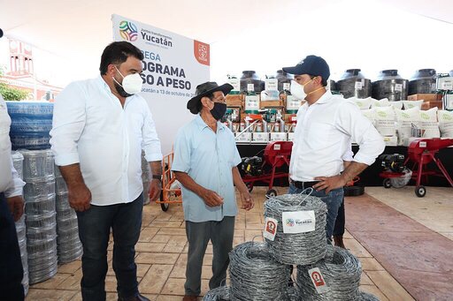 Motul, Yucatán, 16 de octubre de 2020.- Productores yucatecos se sienten respaldados por el Gobierno de Mauricio Vila Dosal al recibir las herramientas, maquinaria y materiales del programa estatal “Peso a Peso”, que necesitan para reactivar el campo y los empleos que esta actividad genera, sobre todo después del paso de los fenómenos naturales que golpearon a este sector con la pérdida de cosechas.