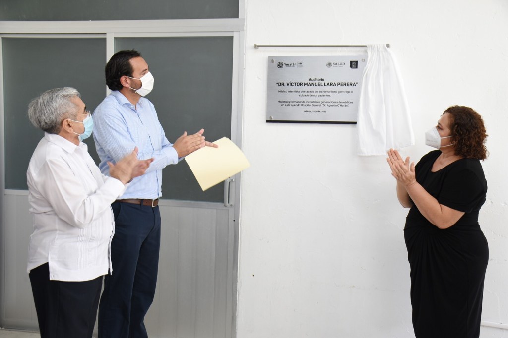 Mérida, Yucatán, 16 de octubre de 2020.- “Honramos la labor de un médico con gran sentido humanista, que dedicó más de 32 años formando becarios en este hospital”, expresó el titular de la Secretaría de Salud (SSY), Mauricio Sauri Vivas, al develar la nueva placa del auditorio del Hospital “Doctor Agustín O’Horán”, que desde este día se llamará “Doctor Víctor Manuel Lara Perera”.