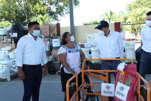 En gira de trabajo por el municipio de Opichén, Vila Dosal distribuyó estas ayudas para hombres y mujeres que se dedican a la agricultura, ganadería y apicultura, quienes siguen trabajando para levantar de nuevo sus unidades de producción luego del paso de las tormentas tropicales “Amanda”, Cristóbal”, “Gamma” y el huracán “Delta”.