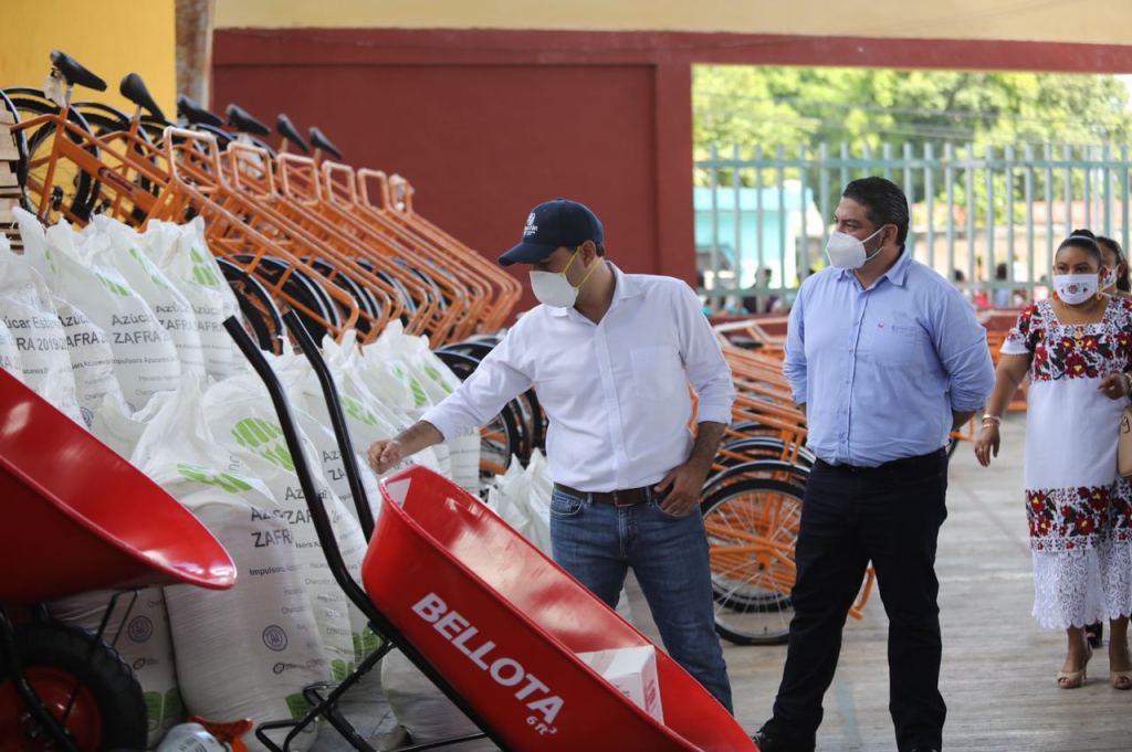 En compañía del alcalde anfitrión, Samuel Uc Poot, Vila Dosal acudió a la Cancha Municipal de Usos Múltiples para supervisar la entrega de las herramientas, maquinaria y materiales a mujeres y hombres dedicados a actividades agrícolas, ganaderas y apícolas quienes fueron afectados por las fuertes lluvias ocasionadas por las tormentas tropicales “Amanda”, “Cristóbal” y “Gamma”, además del huracán “Delta”.