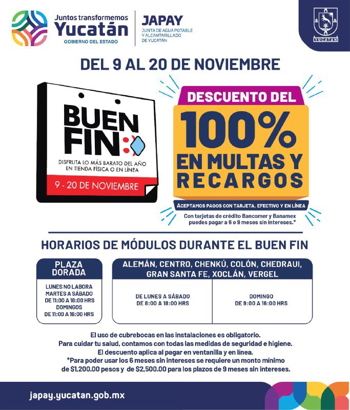 La Junta de Agua Potable y Alcantarillado de Yucatán (Japay) ofrecerá 100 por ciento de descuento en multas y recargos, del 9 al 20 de noviembre, aplicable a quienes pagan en sus módulos de atención, en línea o mediante la aplicación de la paraestatal, ya sea con tarjeta o en efectivo.