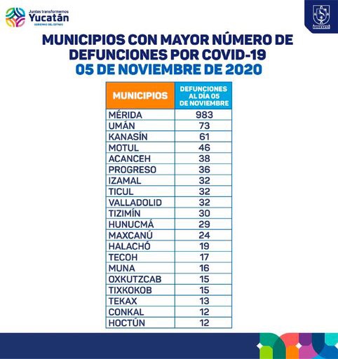 LOS MUNICIPIOS DE YUCATÁN CON MAYOR NÚMERO DE DEFUNCIONES AL DÍA 5 DE NOVIEMBRE DE 2020 SON: