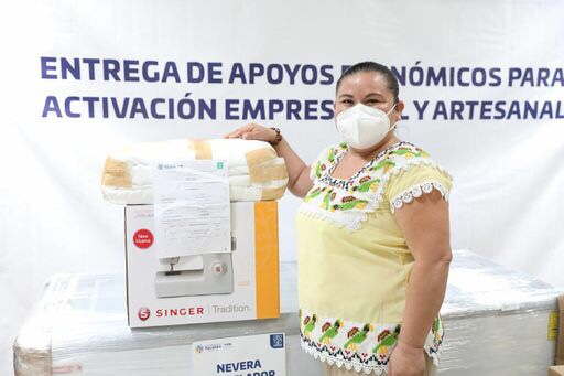Originaria del municipio de Tekax, Lidia Guadalupe Canché Poot recibió una moderna máquina de coser y un paquete de tela que le servirán para iniciar de nuevo su actividad como bordadora, trabajo con el que apoya a su esposo para poder obtener el ingreso familiar.