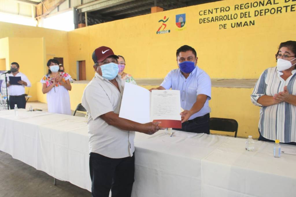 Siguiendo con las medidas de prevención del COVID-19, el alcalde de Umán, Freddy Ruz Guzmán junto a la delegada estatal del Registro Agrario Nacional, Dalia Isela Piña Alberto, el coordinador de los Programas de Desarrollo del Gobierno Federal en Yucatán, Joaquín Díaz Mena y la directora de Promoción y Participación Social de la Secretaría de Desarrollo Social, Marissa Aurora Salazar Azcorra, hizo la entrega de 84 certificados de títulos de propiedad a ejidatarios del municipio, quienes ya contarán con un patrimonio seguro.