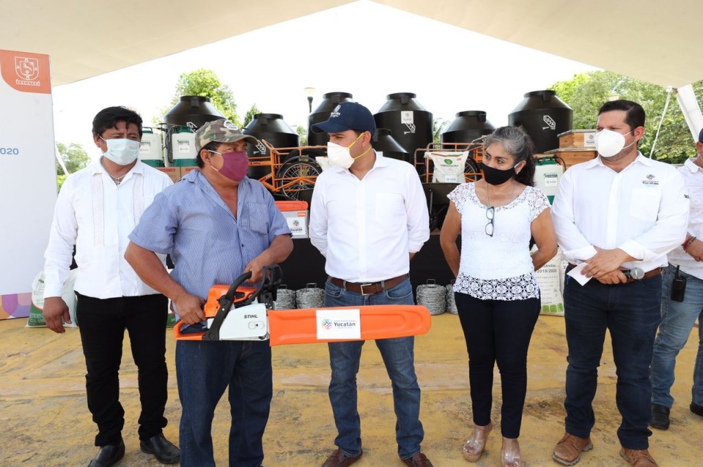 Kaua, Yucatán, 14 de noviembre de 2020.-Productores agrícolas, agroindustriales, apícolas y ganaderos del municipio de Kaua recibieron del Gobierno de Mauricio Vila Dosal herramientas, maquinaria y materiales del programa “Peso a Peso”, apoyo que llega de forma oportuna para detonar la recuperación del campo yucateco e impulsar los miles de empleos que este sector genera.