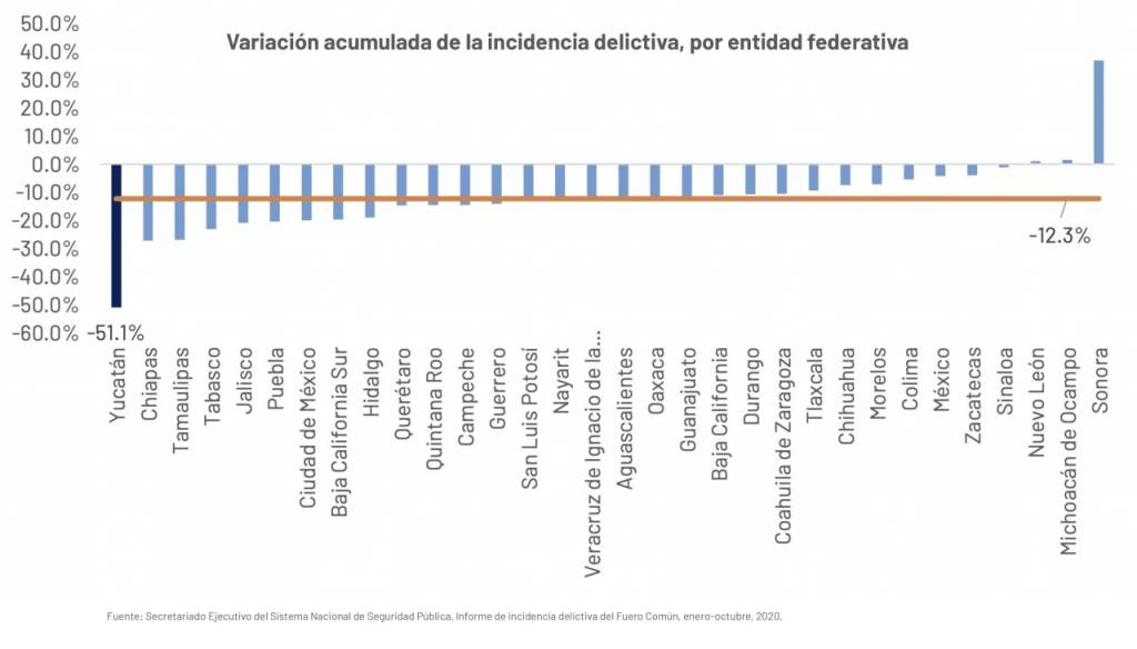 Mérida, Yucatán, 23 de noviembre de 2020.- Yucatán se mantuvo como la entidad del país con mayor reducción en la incidencia delictiva durante los primeros 10 meses del año, al registrar una disminución de -51.1% respecto al mismo periodo en 2019, mientras que a nivel nacional solo redujo en un -12.3% en dicho periodo, de acuerdo al último reporte del Secretariado Ejecutivo del Sistema Nacional de Seguridad Pública, fruto de las acciones en seguridad implementadas por el Gobierno de Mauricio Vila Dosal y la participación ciudadana para preservar la paz y tranquilidad.