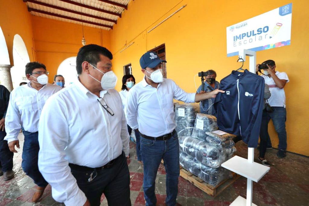 Vila Dosal realizó una gira de trabajo por el municipio de Acanceh, donde continuó con la entrega de estas prendas, acción que, al mismo tiempo, representa un ahorro para las familias con hijos en este nivel; y siguió dotando de becas económicas, apoyo que llega a un total de 16 mil 122 estudiantes de primaria y secundaria y, además de ser un estímulo para los niños, permitirá a sus familias aliviar los gastos de su educación.