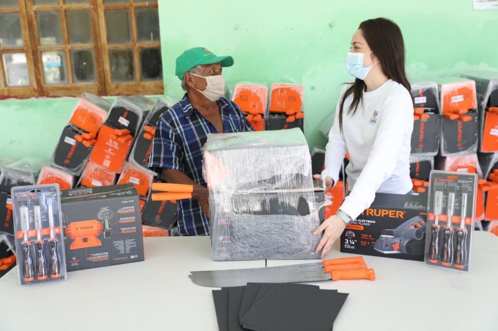 El IYEM entregó en esta ocasión motosierras, routers, machetes, formones, esmeriladoras para los artesanos que trabajan maderas y para los artesanos del ramo textil: hilos, agujas, aros para bordar, tijeras y tela entre otros insumos.