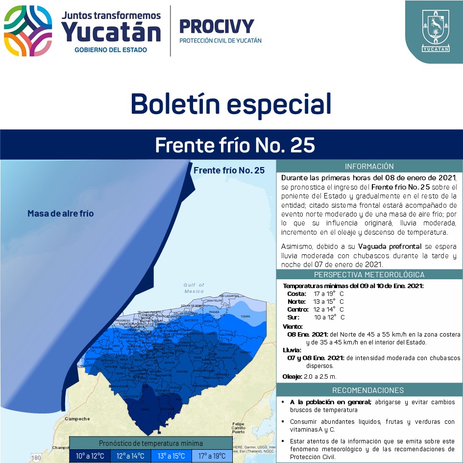Mérida, Yucatán, 6 de enero de 2021.- Ante el ingreso del frente frío número 25 en las primeras horas del 8 de enero, que provocará mínimas de 10 a 12 grados para el sur de la entidad, por instrucción del Gobernador Mauricio Vila Dosal, la Coordinación Estatal de Protección Civil (Procivy) recomienda a la población abrigarse y evitar cambios bruscos de temperatura.