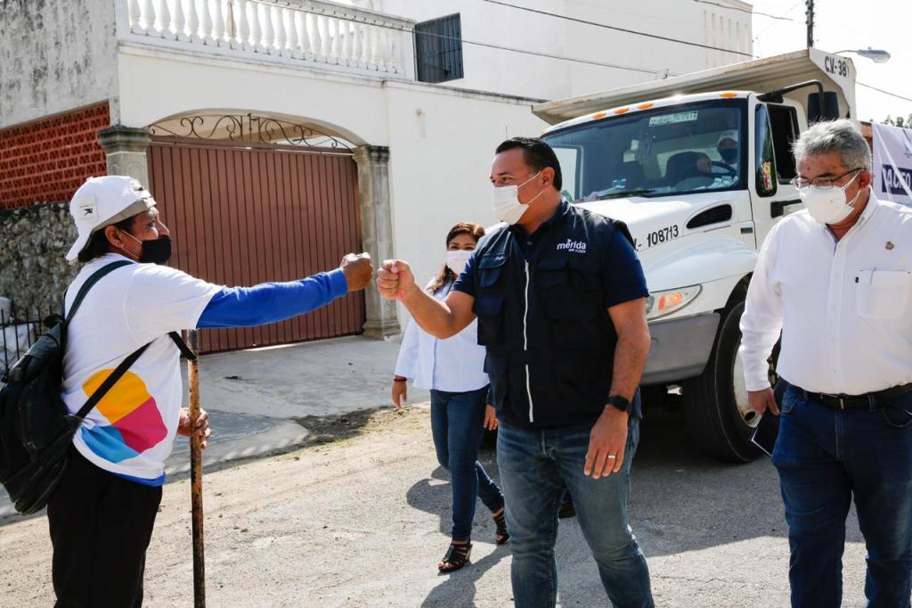 Mérida, 7 de enero de 2021. El alcalde Renán Barrera Concha supervisó esta mañana trabajos de bacheo que forman parte del programa que incluye a todo el municipio, cuyo fin es garantizar las mejores condiciones de las vialidades y atender de manera oportuna los reportes ciudadanos, principalmente en puntos que registran grave deterioro del pavimento.