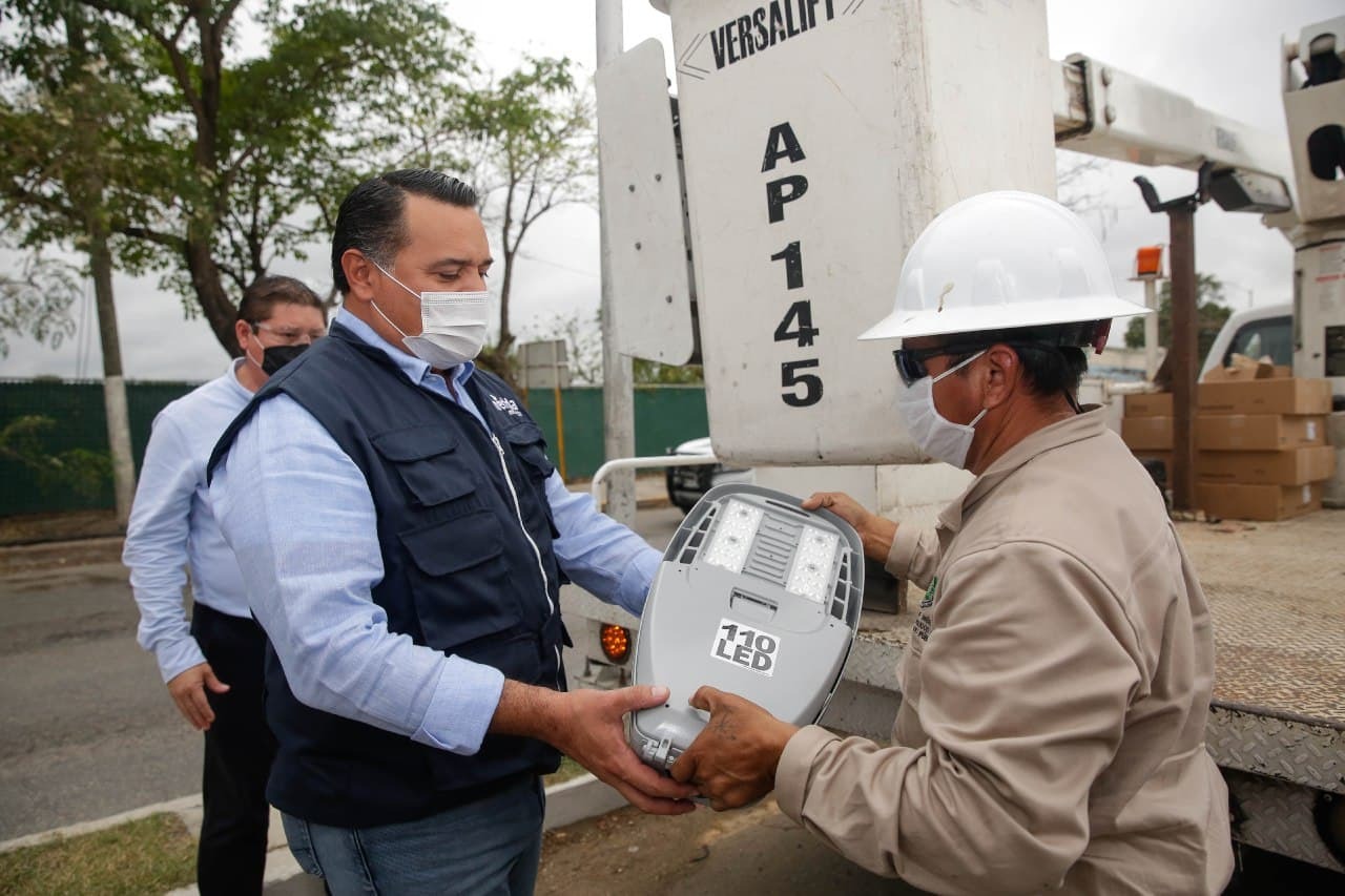 En el lugar, Barrera Concha saludó a Román Cauich y Ricardo Chuc, trabajadores de la cuadrilla municipal del departamento de Alumbrado de Servicios Públicos Municipales, quienes se encargaban del cambio de luminarias.