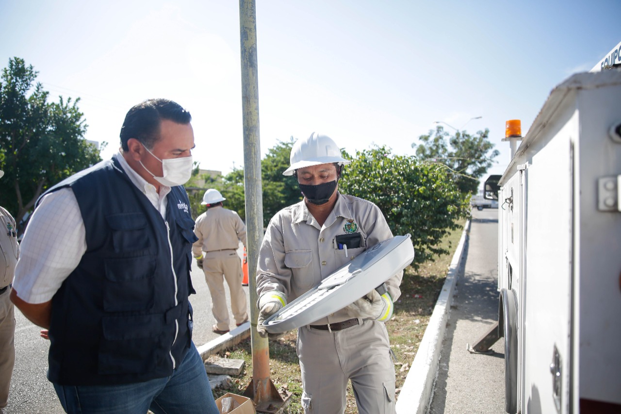 Mérida, 22 de enero de 2021. Con la instalación de lámparas tipo LED en la avenida Yucatán, el Ayuntamiento avanza en la renovación y modernización de la red de alumbrado público en los cuatro puntos cardinales de la ciudad, con el fin de brindar a la ciudadanía servicios de calidad, que además de ser eficientes, generan ahorros significativos en el presupuesto municipal, subrayó el alcalde Renán Barrera Concha.