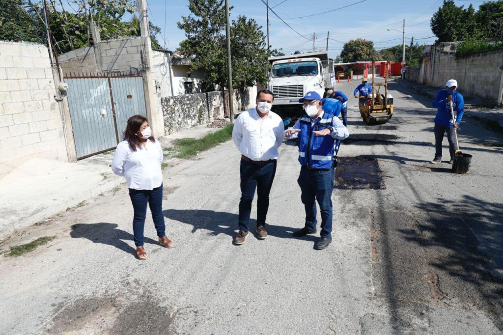 Acompañado de los directores de Obras Públicas, David Loría Magdub y de Atención Ciudadana, Eira Pólito García, el Presidente Municipal recorrió la calle 28 por 81-A y 83 de la colonia San José, para supervisar el avance del programa de bacheo.