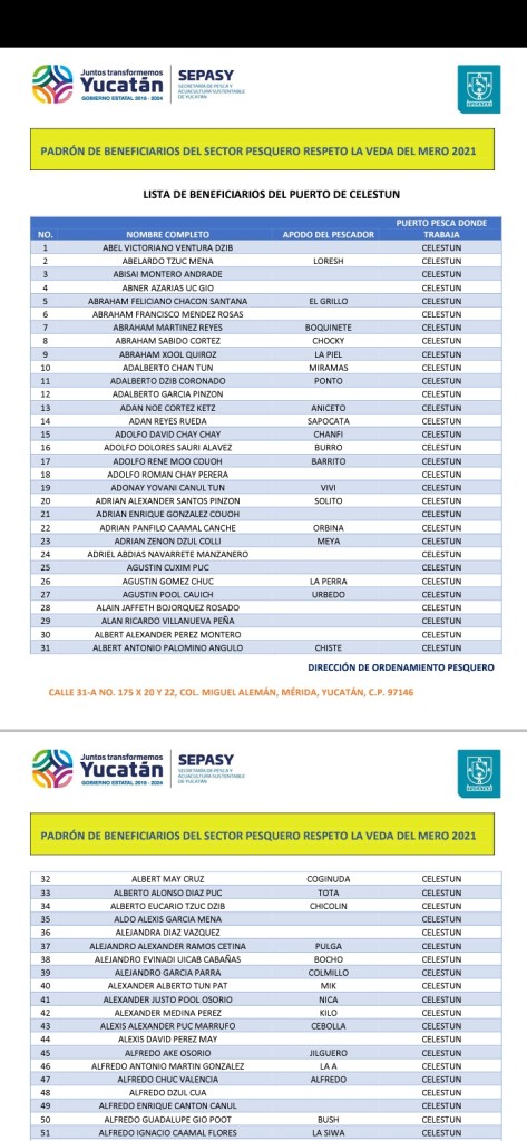Por último, invitó a los beneficiarios a informarse sobre el listado del padrón, del calendario de entregas del programa Respeto a la Veda del Mero 2021 que se puede consultar en la siguiente liga: https://pesca.yucatan.gob.mx/files/get/866; o bien con sus autoridades municipales.