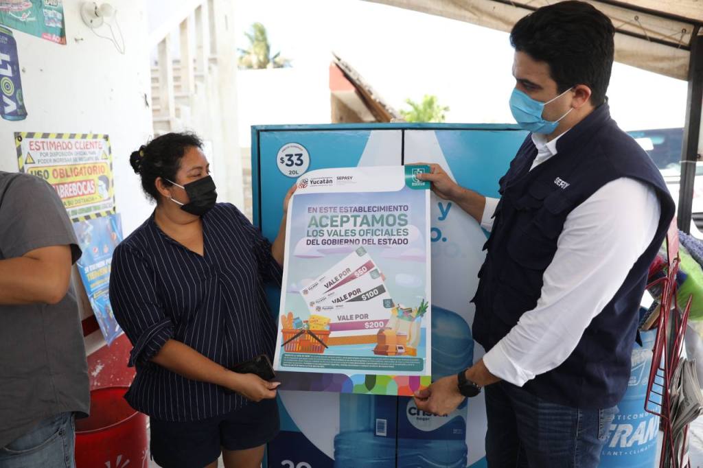 Durante esta primera jornada de entregas de este programa de apoyos para los pescadores, Combaluzier Medina y Rihani González también acudieron a algunos establecimientos de venta de abarrotes en las comunidades de Telchac Puerto para firmar los acuerdos en los que los dueños y dueñas de dichos lugares se comprometen a recibir los vales de despensa que otorga el Gobierno Estatal y con ello impulsar la economía local de las demarcaciones donde se entregan los recursos.