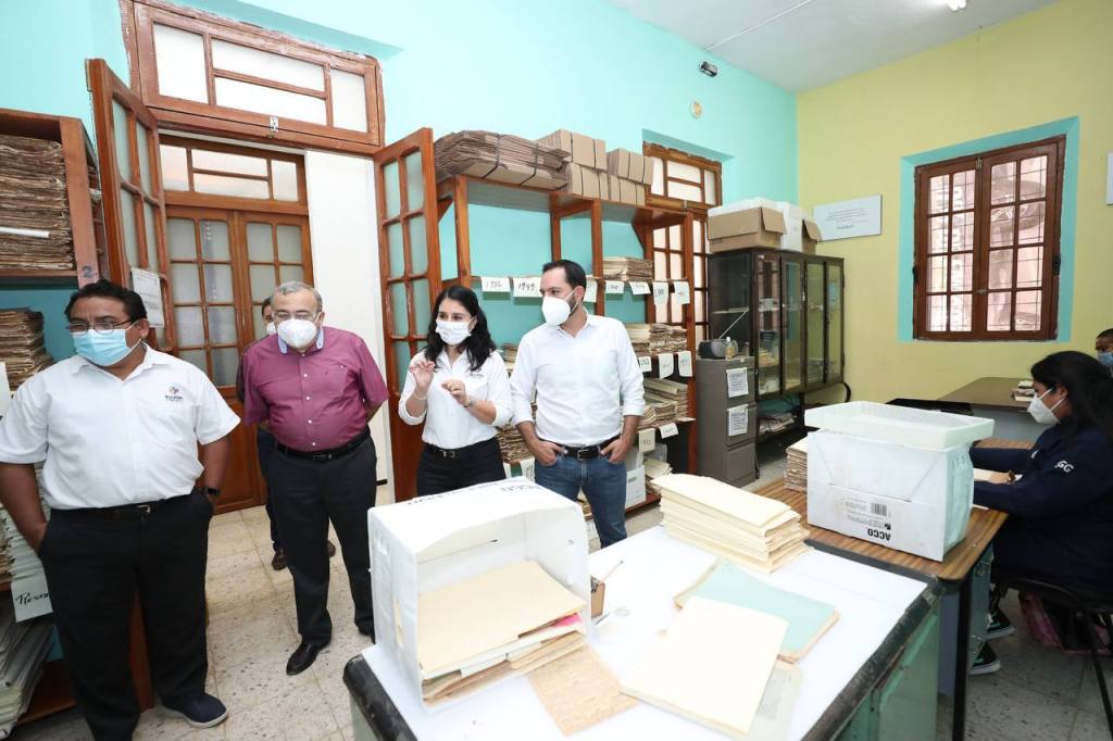 En el AGEY, Vila Dosal recorrió las áreas de archivo de concentración, que es donde se reciben los documentos que genera todas las dependencias del Gobierno del Estado y otras instancias; de archivo histórico, informática y restauración, así como la de consulta al público, en donde constató los procesos que se llevan a cabo y observó documentos, como un copiado de decreto del Gobernador Miguel Barbachano de 1849.