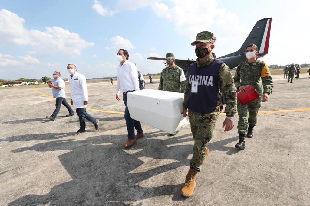 El titular de la SSY, en compañía del Comandante de la 32 Zona Militar, General de Brigada, Francisco Miguel Aranda Gutiérrez, constató a las 14:52 horas de este domingo, el aterrizaje de una aeronave tipo Spartan matrícula 3403 de la Fuerza Aérea Mexicana (FAM) a la Base Aérea número 8, al sur de esta ciudad, proveniente de la Ciudad de México, con un lote de vacunas, las cuales fueron descargadas por elementos del Ejército, y colocadas en un camión refrigerado thermoking de la SSY para ser trasladadas al almacén estatal de vacunas, desde donde comenzará su distribución hasta los puntos de vacunación.