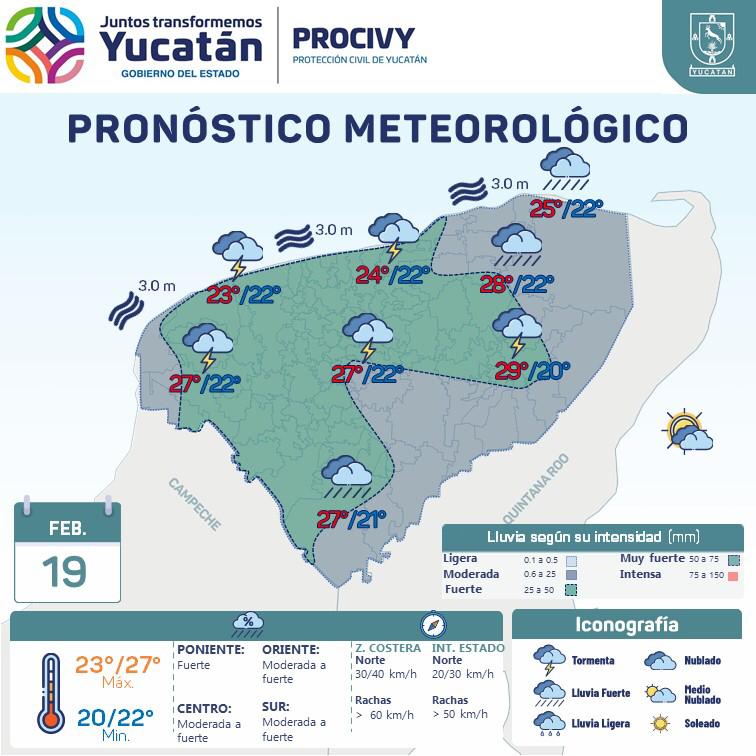 Mérida, Yucatán, 19 de febrero de 2021. La vaguada que tuvimos prácticamente durante toda la noche y madrugada en el poniente del estado ha dado paso a los efectos directos del frente frío número 36, que se desplaza hacia el oriente, donde tendrá menor intensidad, informó el titular de la Coordinación Estatal de Protección Civil (Procivy), Jesús Enrique Alcocer Basto.