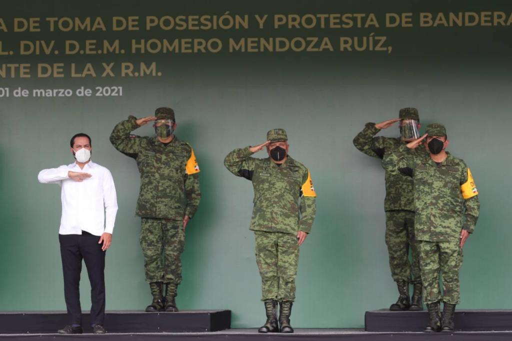 Mérida, Yucatán, 1 de marzo de 2021.- El General de División Homero Mendoza Ruiz asumió este día la comandancia de la X Región Militar, en una ceremonia que encabezaron en esta ciudad el Gobernador Mauricio Vila Dosal y el Inspector y Contralor General del Ejército y Fuerza Aérea, General de División Gabriel García Rincón.