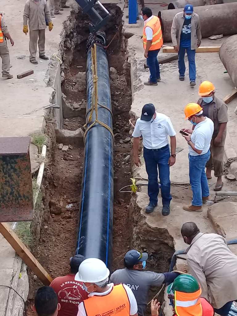 Mérida, Yucatán, 4 de marzo de 2021.- Por instrucciones del Gobernador Mauricio Vila Dosal, la Junta de Agua Potable y Alcantarillado de Yucatán (Japay) reemplazó un tramo de 18 metros de tubería de acero de 30 pulgadas por un poliducto de alta densidad de 24 pulgadas a la salida del cárcamo de la 42 Sur, a fin de mejorar el suministro del vital líquido en 25 colonias de esa zona de la ciudad.