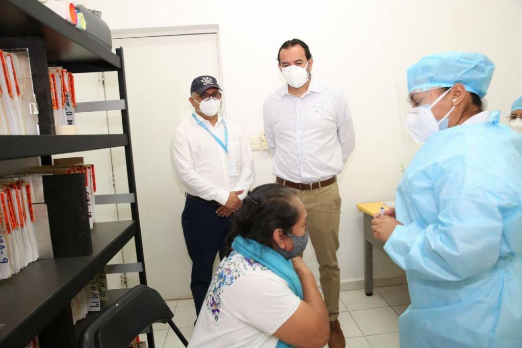 Acompañado del Director del Centro de Salud de Ticul, Manuel Pérez Canul y del jefe de Unidad de Atención Médica de la Jurisdicción Sanitaria No. 3, Juan Roberto Ayuso Centurión, Sauri Vivas constató el arranque de la vacunación en Ticul, donde Javier Aldana y Vázquez, fue de los primeros de la localidad en recibir una de estas dosis.