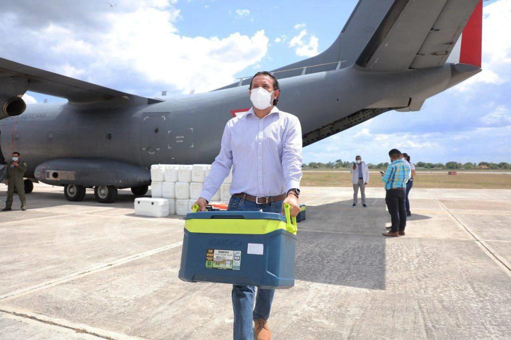 Junto con el coordinador Estatal para la Vacunación Covid-19, capitán de Corbeta Carlos Gómez Montes de Oca, Sauri Vivas constató la descarga del lote a cargo del personal del Ejército, el cual fue colocado en un camión thermoking de la SSY, para luego ser trasladadas al almacén estatal de vacunas, desde donde se distribuirán a los lugares donde se aplicarán.