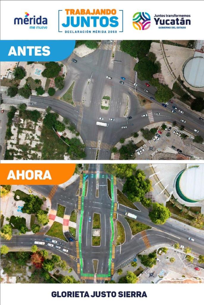 El funcionario estatal detalló que en la glorieta del monumento a Justo Sierra se realizó la colocación de boyas reflejantes, la conformación de camellones con tierra y jardín, señalética con pintura y señalética vertical para el “cruce ciclista” y de personas con discapacidad, la intervención en banquetas, rampas y guarniciones con pintura de color blanco y la aplicación de pintura termoplástica en pavimento raya de colores verde, amarillo y blanco y pintura verde brasil en ciclopista.