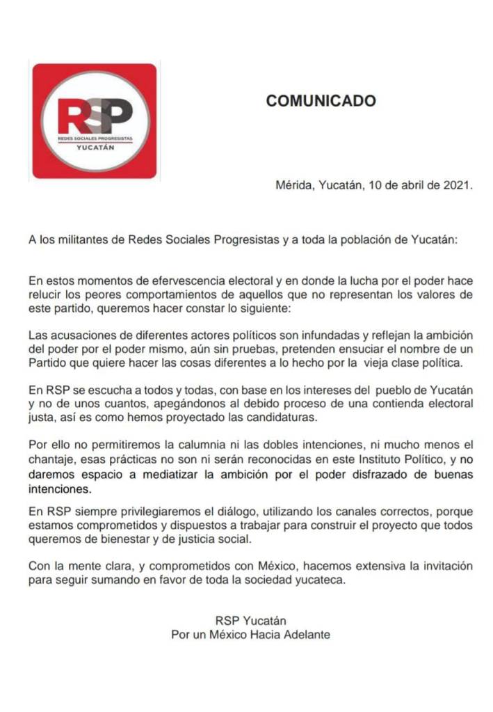 A los militantes de Redes Sociales Progresistas y a toda la población de Yucatán: