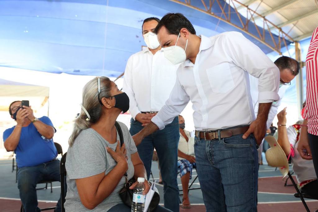 Mérida, Yucatán, 17 de abril de 2021.- La vacunación contra el Coronavirus entre adultos mayores de Mérida ya rebasó las 100,700 dosis aplicadas después de 10 jornadas, pero el proceso todavía continúa durante este fin de semana y el lunes para este sector de la población de la capital yucateca, se informó en la visita que realizó el Gobernador Mauricio Vila Dosal por el módulo habilitado en la escuela Secundaria Técnica Número 75 del complejo habitacional Ciudad Caucel.