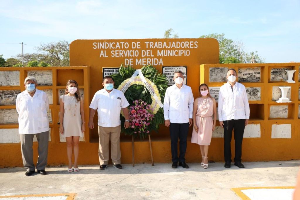En el marco de la celebración, desde temprana hora de este viernes, el Alcalde encabezó sendas ofrendas florales y guardias de honor en los mausoleos del Sindicato de Trabajadores al Servicio del Municipio de Mérida de los cementerios General y de Xoclán, en memoria de los trabajadores fallecidos.