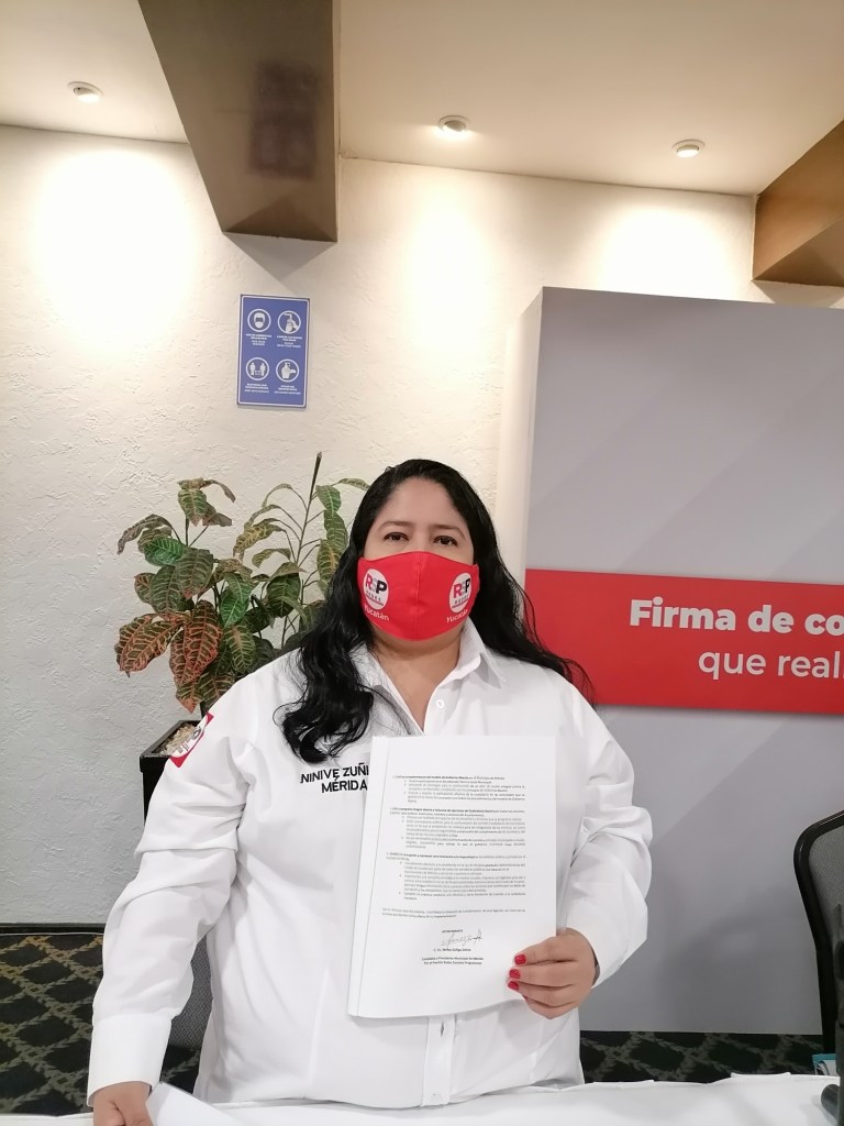 Mérida, Yucatán, 26 de abril de 2021.- Ninive Zúñiga Zetina, candidata a la alcaldía de Mérida, por Redes Sociales Progresistas en Yucatán, participó este día en el foro ciudadano del Colectivo, ¡Ya Basta!, en el cual se llevó a cabo la firma de Compromisos de Cumplimiento de la Agenda Ciudadana 2021-2024, que realizan los Candidatos a la Presidencia Municipal de Mérida.