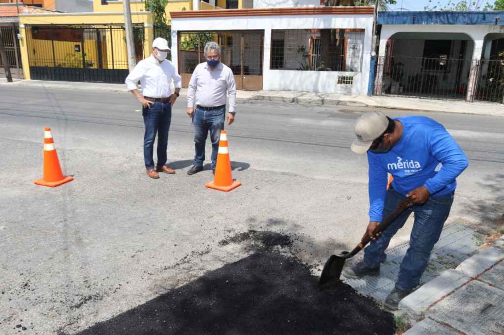 Mérida, 29 de abril de 2021. El alcalde, Alejandro Ruz Castro, supervisó hoy en la colonia Bojórquez, los trabajos del programa de Bacheo Permanente, acompañado del director de Obras Públicas, David Loría Magdub.