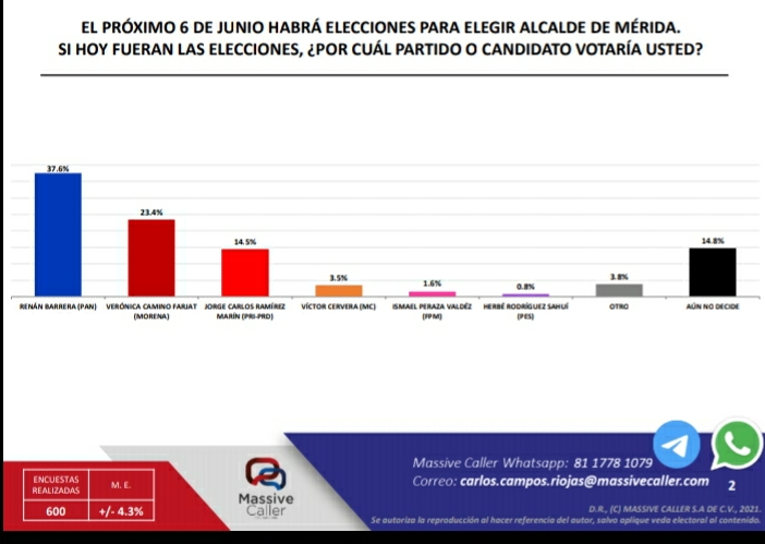 De acuerdo con la Encuesta Telefónica Municipal de Massive Caller, la intensión del voto para elegir Presidente Municipal en las comunidades de Mérida otorgan al panista una superioridad de 14.2% por encima de su rival más cercana, Verónica Camino Farjat, del partido Morena, que tiene un puntaje de 23.4% de preferencia del electorado, según la encuestadora.