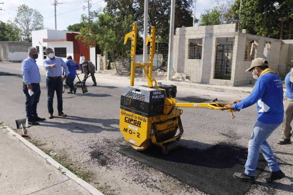 Mérida, 8 de mayo de 2021. El Ayuntamiento de Mérida a través de la dirección de Obras Públicas, redobla esfuerzos en los trabajos de bacheo en colonias y comisarías de la ciudad y hasta el momento, previo a la temporada de lluvias, tiene un avance del 80% en la rehabilitación de calles dañadas.