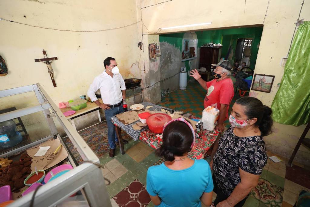 Previo a una visita de supervisión en el Centro de Salud Urbano de la colonia San José en Kanasín, donde se realiza la aplicación de las primeras vacunas contra el Coronavirus para personas de 50 a 59 años, el Gobernador aprovechó para hacer una parada en ese pequeño negocio de antojitos yucatecos.