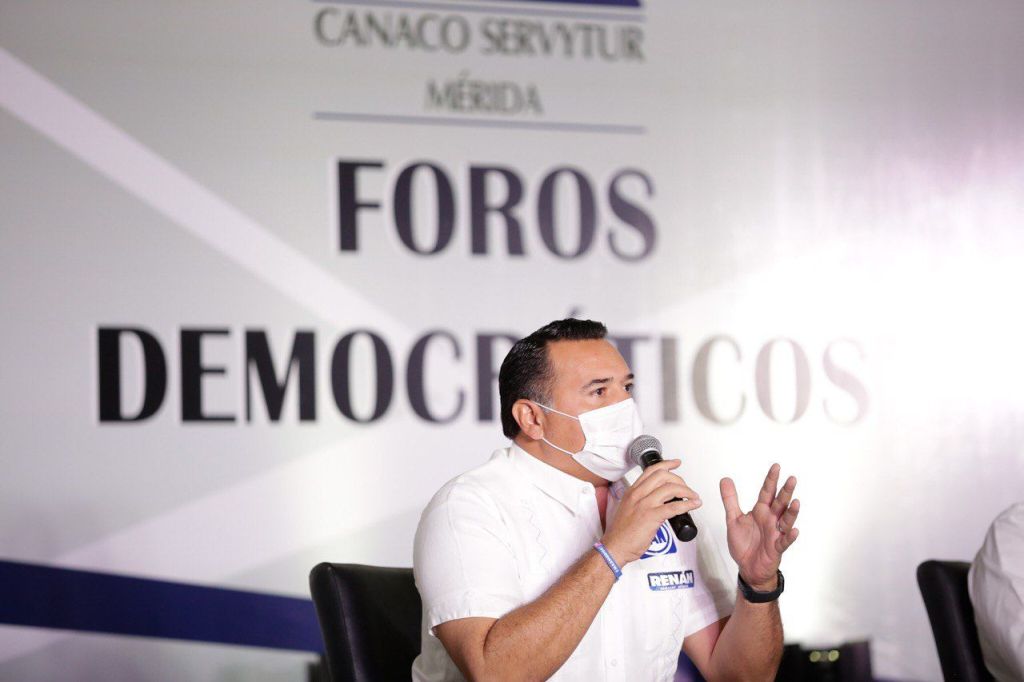 Mérida, 11 de mayo de 2021. El candidato del PAN a la Presidencia Municipal, Renán Barrera Concha, participó esta tarde en el Foro Democrático con aspirantes a la alcaldía organizado por Canaco Mérida, donde expuso los puntos que interesan al comercio organizado de la capital yucateca.