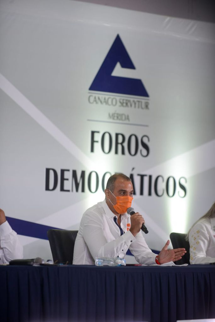 El abanderado Naranja participó en el foro de candidatas y candidatos convocado por la Cámara Nacional de Comercio, Servicios y Turismo Canaco-Servytur de Mérida que preside Iván Rodríguez Gasque.Al exponer sus propuestas, observó que éstas surgieron precisamente de las demandas de la ciudadanía, porque todos los meridanos viven los mismos problemas debido a una mala administración municipal.