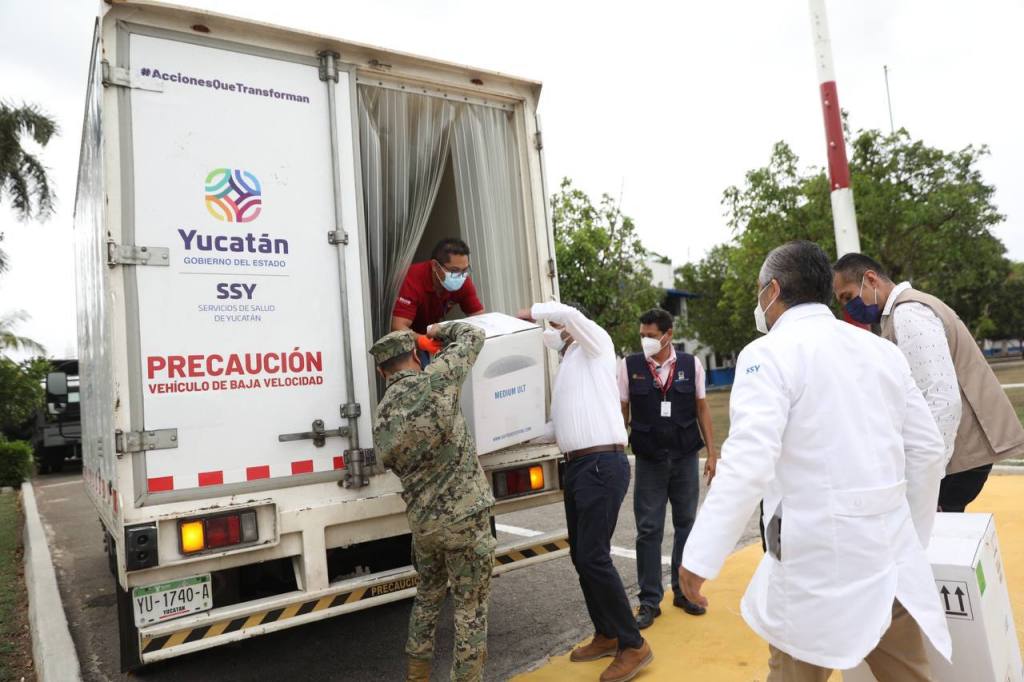 Acompañado del coordinador Estatal para la Vacunación Covid-19, capitán de Corbeta Carlos Gómez Montes de Oca, Sauri Vivas constató la descarga de las vacunas a cargo del personal del Ejército mexicano, el cual fue colocado en un camión thermoking de la SSY, para luego ser trasladadas al almacén estatal, desde donde se distribuirán a los lugares donde se aplicarán.