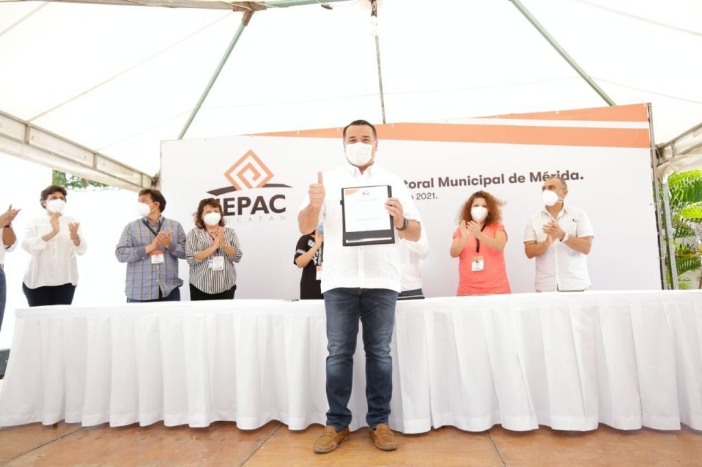 Mérida, 12 de junio de 2021. Tras concluir el cómputo en el Consejo Municipal del Instituto Electoral y de Participación Ciudadana de Yucatán, Renán Barrera Concha recibió esta tarde la constancia de mayoría relativa que lo acredita como alcalde electo de Mérida, con lo que también se convierte en el primer Presidente Municipal reelecto en la historia de la capital yucateca.
