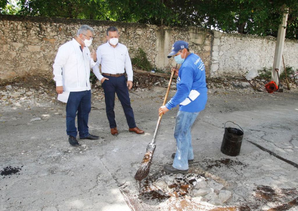 Acompañado de David Loría Magdub, director de Obras Públicas, el Alcalde recorrió la calle donde un grupo de trabajadores removía con picos y palas el pavimento afectado para posteriormente realizar el proceso de riego, depositar la mezcla asfáltica y compactarla con apoyo de maquinaria manual.