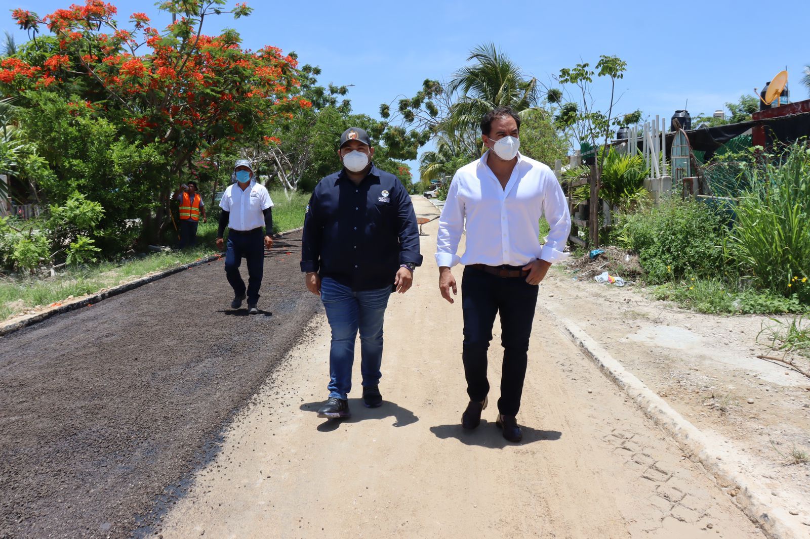 Progreso, Yucatán a 25 de junio de 2021. Esta tarde el alcalde de Progreso, Julián Zacarías Curi, acudió a la comisaría de Flamboyanes para supervisar la aplicación de poreo que servirá para recibir la carpeta asfáltica, esto como parte de los trabajos de repavimentación en dicha localidad.