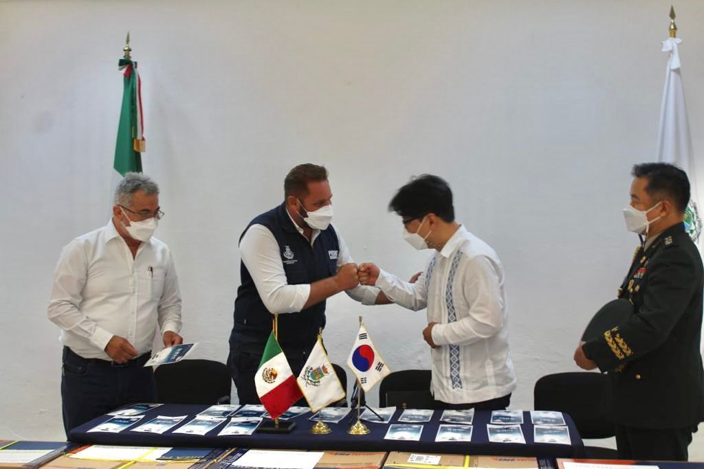 Recibió el donativo en representación del alcalde Alejandro Ruz Castro, el director de Desarrollo Social, José Luis Martínez Semerena, en un evento al que asistieron el Coronel Yoon-Joo Kim y Jae-IL Park, agregado militar y cónsul, respectivamente, de la Embajada de la República de Corea en los Estados Unidos Mexicanos; Luis Olaf Olsen Lee, de la Asociación de Descendientes Coreanos en Yucatán Koryuc A.C. y David Loría Magdub, director de Obras Públicas del Ayuntamiento.